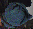 width to make a tight roll. The wing tips need to overlap, however, because they will eventually hold the roll in place. I didn’t get a shot of what you do next, but you’re smart you can figure it out. Fold the cape piece down (exactly as it is with that overlap) at the collar. You can see the collar line in the picture, it is right above the button. The cape will be facing the roll you are holding with your knee, with the opening in the cape towards said roll.