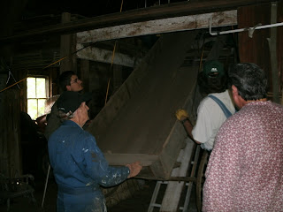 It was not easy fetching the wagon out of the hayloft. The current owner had used his barn over the past 30 years or so as a giant work shed—it had all sorts of things cluttering it up, including a pump organ, a 50’s era gas stove, and two 50’s era sports cars in extreme disrepair (little more than shells with engines). All of this, plus a ton of lumber had to be moved just to make a path to extract the horse cart. And then there was a hundred years of filth (lots of coons had been in and out of there over the years) that we stirred up.