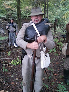 Pvt Steve Winston also galvanized, wearing is great coat in the heat to hide his butternut.  He took a hit, and when the battle was over we raided his corpse, nearly stripping him bare, for a show for the public.  He had to walk back to camp in socks.