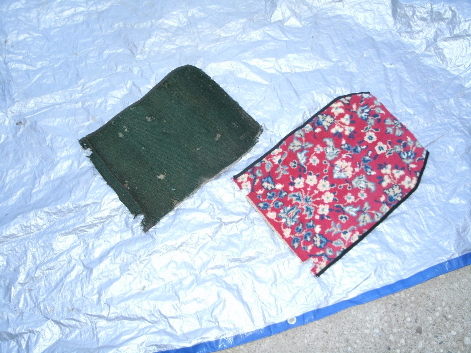Carpet cut and black ribbon sewn on the edges. Original fabric is shown beside it. |