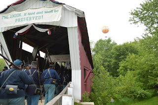 Conner Prairie had numbers of about one hundred per side—not exactly a large event.  Often we have friends on the other side we’d like to visit with.  The 4th Ohio Company B, for example—my original company when I first started Civil War reenacting—was there.  But there was more there—the Yankee Camp was in a small period village, an exhibit called “The Civil War Journey”, and many of the Confederate soldiers had a desire to visit this exhibit.  So, the “out” we agreed upon with the Yankee commander—where Confederates could enter exhibit—was that they had to remove their coats, and women could have no confederate pins.