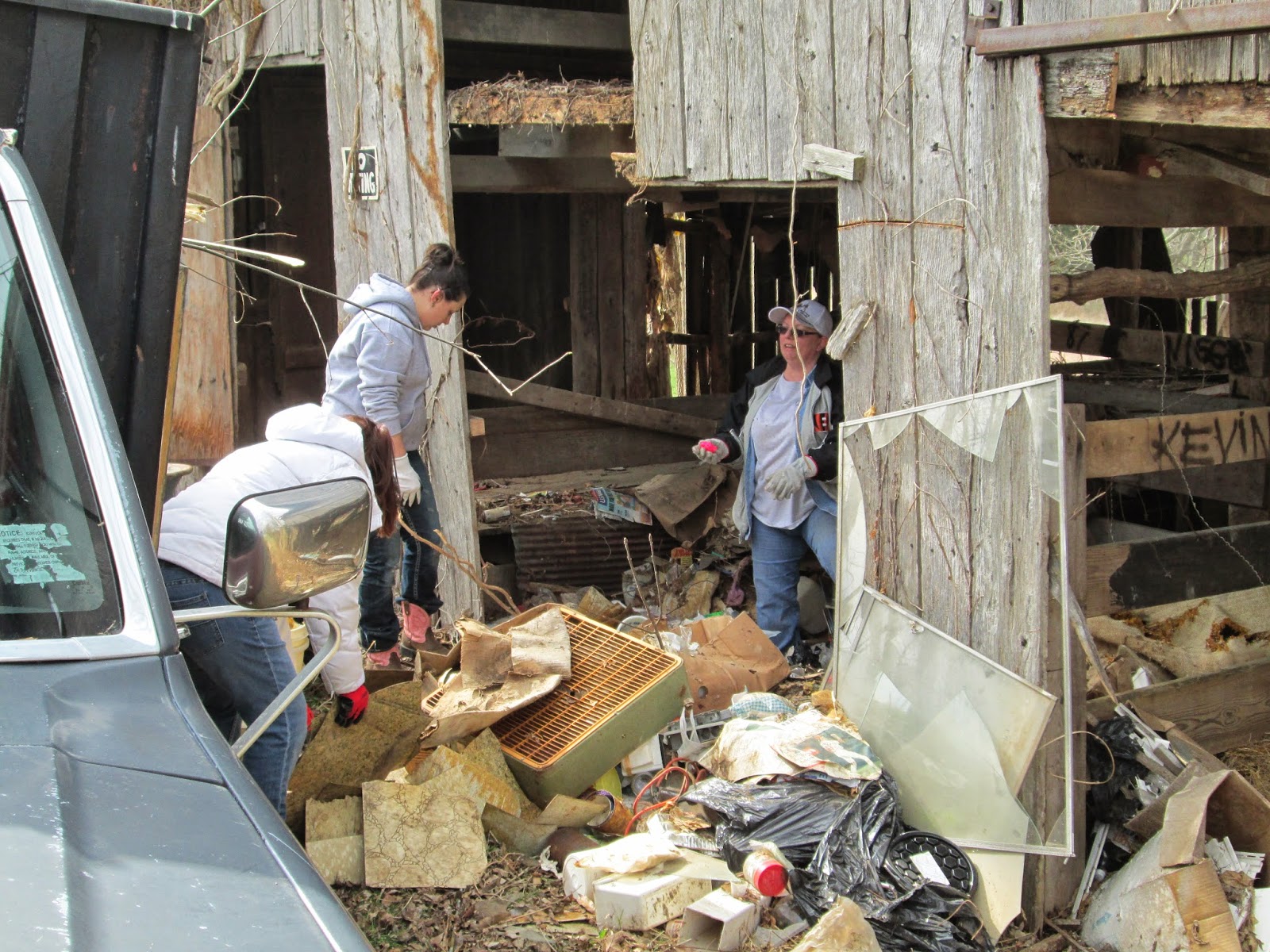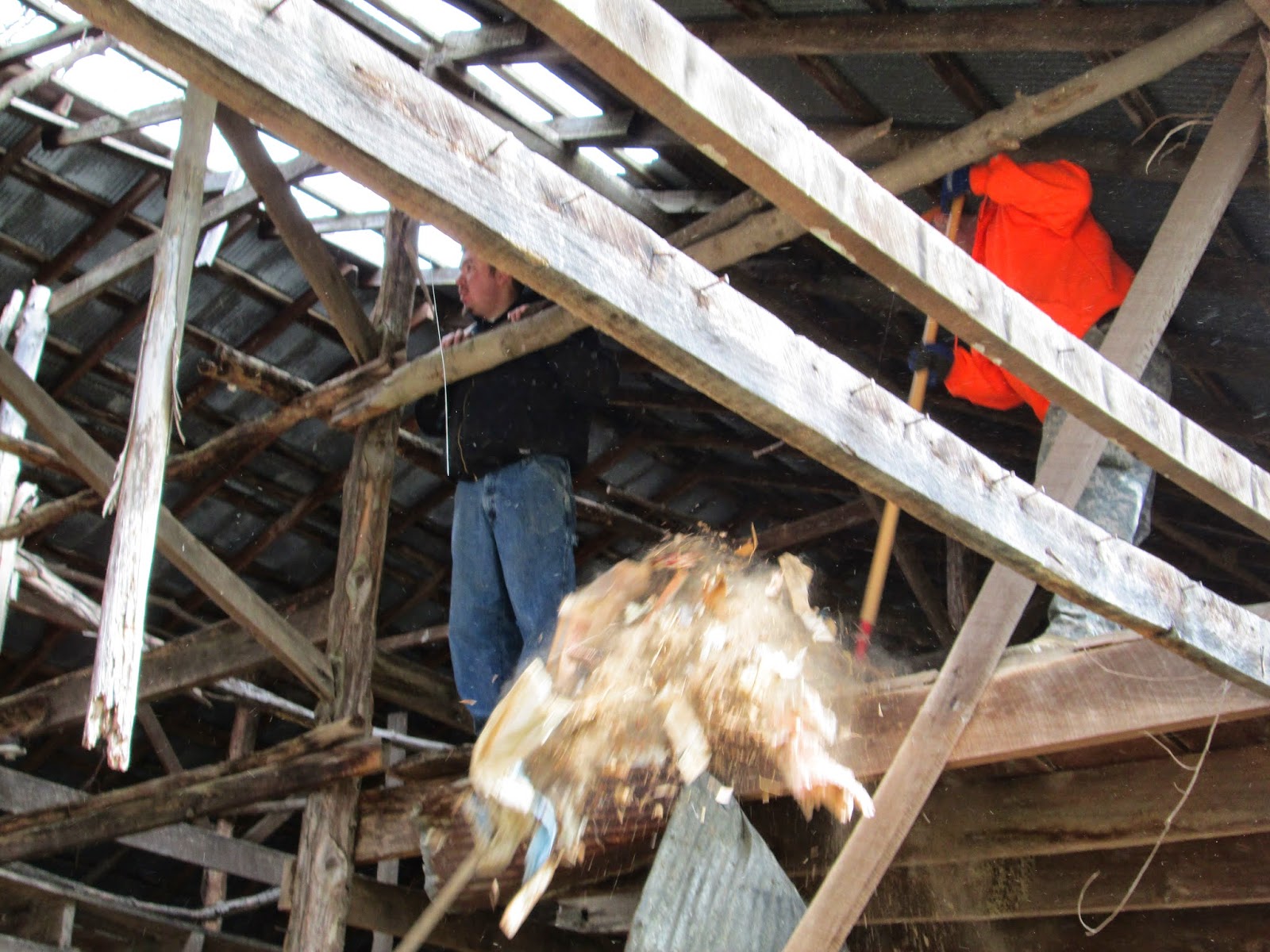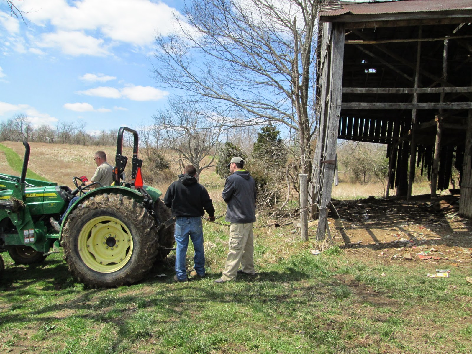 We drove to the barn and started hauling out garbage to the dumpster and tearing out boards. At one point a tractor was used to help us haul things us. We also discovered a rather fantastic smell that chased us out of the building on a regular basis.