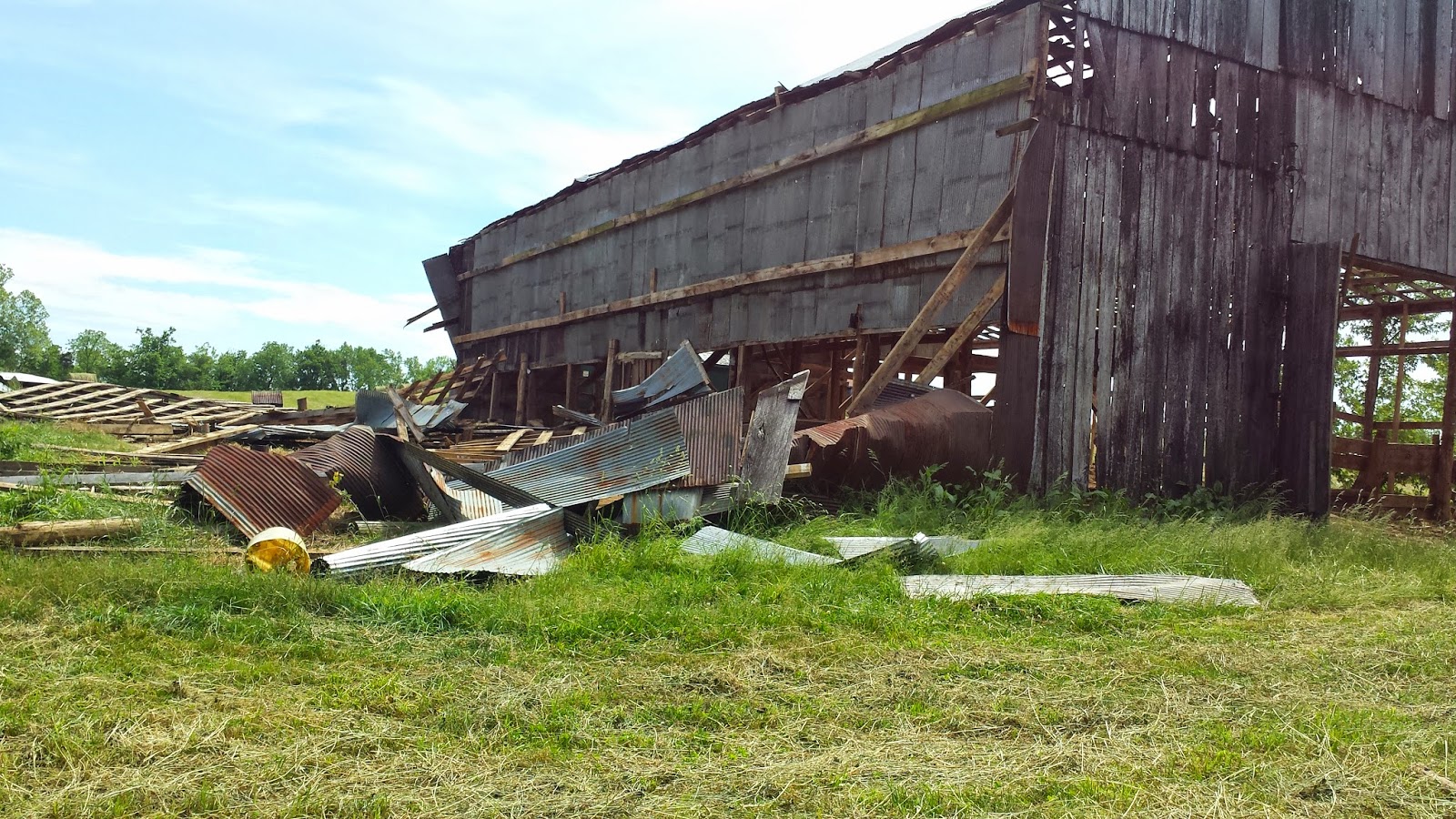 It wasn’t long when all the garbage was removed and they had me come down from the roof. They had a medium-sized tractor and used it to push the structure over. It didn’t have any of the supports that the barn from last year had, so the building went down quick, and we piled the rubble into piles to be taken away or burned.