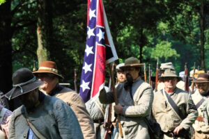 Since we represent a western-theater company, our 1st Tennessee, which was part of Maney’s brigade, was not at Appomattox. But Turney’s brigade was, and there was a second 1st Tennessee that was part of Turney’s, so we bore the flag of the Army of Northern Virginia, the St Andrew’s Cross and Confederate Battle flag, instead of our flag, which was the Polk pattern flag.