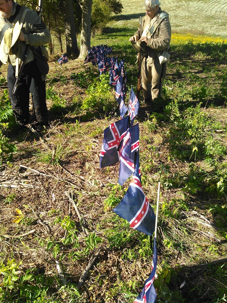 As the brigades returned to camp, Co D joined us as we marched nearby to where thirty of the original 1st Tennessee soldiers had fallen to hold a small memorial service to them. Each of us had been given a couple of Polk-pattern flags to match the 1st Tennessee’s battle flag, and the names of the fallen were read off.  Each flag had a name, and as that name was called off, we placed the flag into the ground.  When all names were called off, the line of flags represented a battle line as they might have had at the battle.