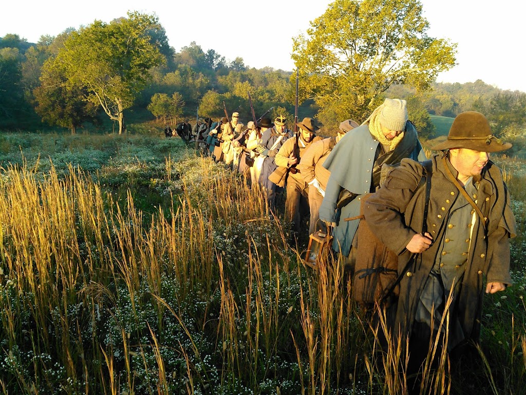 As dark encroached, most of us loaded our knapsacks with extra blankets and put on our great coats to march back to Starkweather Hill.  Our goal was to come as close as we could determine to where Marcus Toney wrote that he had buried the dead from the original Company B.  It was a dark march as Company D from the Tennessee Valley Battalion joined us and we only had a couple of lanterns and moonlight to guide the way.  Capt Sharp led the way into the woods, hitting his shin on a rock when deciding we were probably as close as we were going to get.  We laid our ground cloths down on the incline and covered up for the night.  Pvt Compton brought some charcoal to get a fire going, but I think we were all too tired to really care about much of one, but Capt Sharp did put together a bit of dead brush for a ten minute fire.